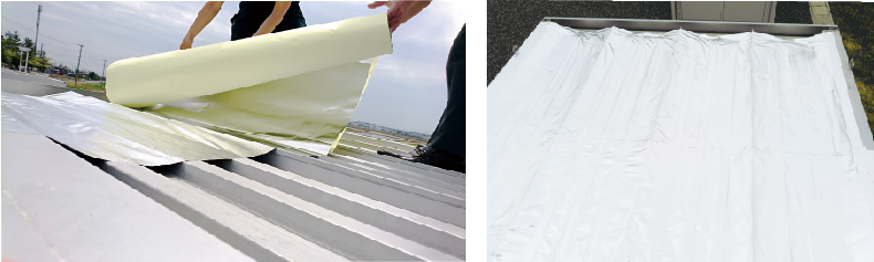 折板の屋根に「マグネットピン」でクールマジックフィルムを取り付けます。